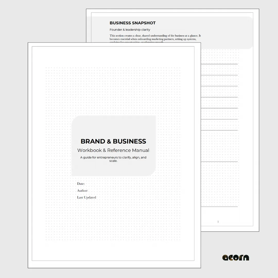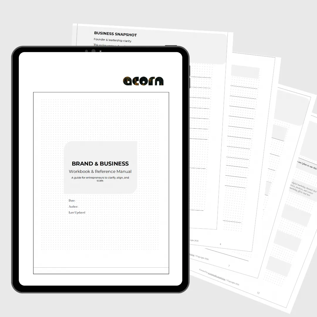 The Brand & Business Foundations Workbook & Reference Manual is a practical, fillable resource designed to help entrepreneurs document what matters most, align sales and marketing, and build a business that can grow with confidence.